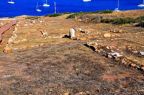 Below: Inside the fortification is a settlement, first found in 1907 by Valerios Staes. The main feature is a street, 3-3.60 m wide and 100 m in revealed length. On both sides of the main street narrower streets formed regular blocks of buildings. The settlement underwent several transformations, with the phase now visible belonging to the Hellenistic period. |