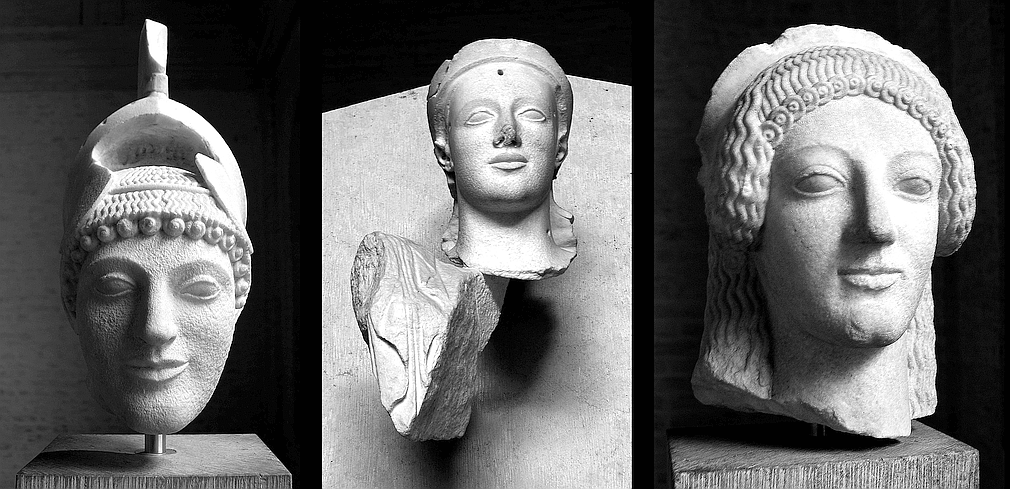 Below from left to right: Woman's head with helmet, probably Athena. - Athena from the east pediment. - Head of a sphinx from the northeastern corner of the temple's roof. |