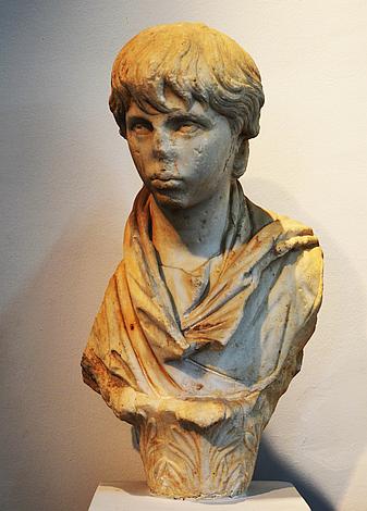 Above left: Figurine, probably Hellenistic (no further information available). - Above center: Statue of Antinoos from the Roman baths at Edipsos. The young man is crowned with ivy leaves, bears a leopard skin on the body, and holds part of a stick with the sacred ivy (a symbol of Dionysos) in the left hand. Parts of the hands and legs are missing. Dated to the reign of Hadrian (2nd century AD). - Above right: Headless statue of Apollo from "Polles Kamares" at Chalkis. The god is represented leaning on the trunk of a tree. It is a copy dated to the Roman period. |