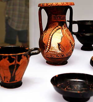 Above left: Black-figure kolumn krater with erotic scenes (575 - 550 BC). - Above right: Attic vases (5th century BC): 1. black-figure skyphoi decorated with the iconographic repertoire of Apollo and Dionysos; 2. red-figure pelike (ca. 470 BC) of Hermonax; 3. black-glaced cups. - Below left: Attic red-figure calyx krater, decorated with a sacrificial scene (ca. 400 BC). - Below right: Red-figure Attic vases (400 - 350 BC): 1. Pelike with griffins and an Amazon; 2. small bell krater with a coquettish lady visited by Eros; 3. skyphoi with maenads and men dressed with himation; 4. bronze cauldron of a Macedonian workshop. |