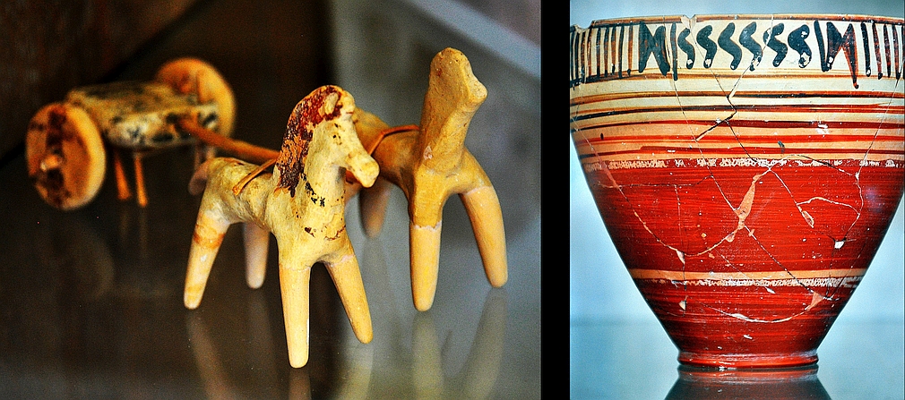 Above: Helladic figurines of horsemen. - Below: Horses pulling a carriage, Helladic, and a Helladic vase. |