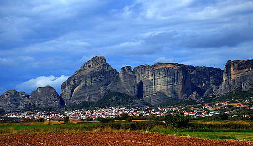 Near the villages of Kalambaka and Kastraki one of the weirdest Greek landscapes attracts visitors from all over the world. From the plain of the river Peneios, rock formations rise more or less perpendicular to a height of up to 300 m. Once mighty rivers from the nearby Pindos mountain range eroded this mass of rocks, forming a stone forest with isolated pinnacles and deep ravines in a setting of unearthly beauty. In all times, these almost inaccessible rocks were a place of refuge for the people of the area. The first hermits settled here in caves around AD 950. In the turbulent times of the 14th century, the first monastery - no longer preserved - was founded on the Doupiani rock, and shortly afterwards the rock monastery of "Megalon Meteoron", still existing today. |