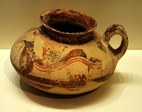handle, an opening, sometimes narrow, from which to pour, sometimes with a pouring lip.