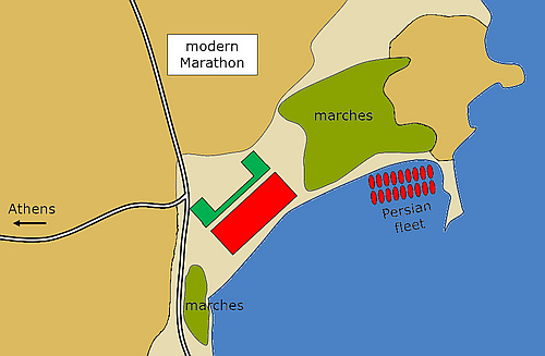 Eretria, the Persians landed in the bay of Marathon, where they were awaited by the Athenians under the command of