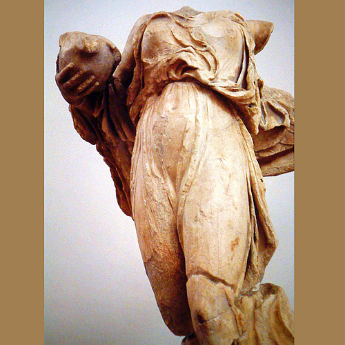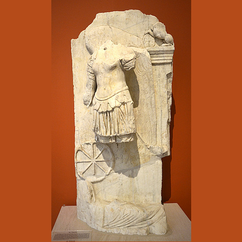 In ancient Greek mytholgy, the winged goddess of victory, who was equally evoked by warriors and