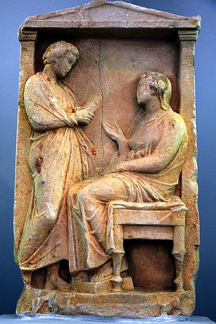 Above left: Relief of a panther and deer, Platanistos, end 6th century BC. - Above right: Relief of the sacrifice of a ram, Larymna, 5th century BC. - Below left: Votive relief of the gods Dionysos and Hades, Karystos, 4th century BC. - Below right: Golden wreath, probably Hellenistic. |
