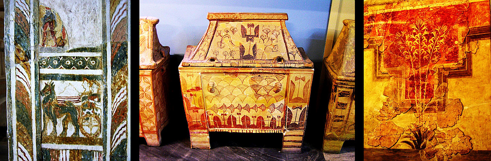 Above from left to right: The narrow side of the Agia Triada sarcophagus shows a