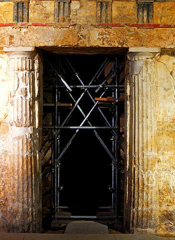 Monumental burial structures like this tomb were founded during the return of the veterans of Alexander's campaign to the East (last decades of the 4th century BC). One of them was the nobleman Peukestas who was born in Mieza, became a most distinguished officer in the service of Alexander the Great and was awarded the rule of Persia. The depiction of a warrior in the painted panel and the martial iconographic themes of the friezes clearly refer historically and ideologically to the victory over the Persians. It is therefore conjectured that this tomb could belong to Peukestas. Above right: The severely damaged upmost part of the façade. Left: The central door leads to the ante-chamber and the actual burial chamber, but there is no access for visitors. |