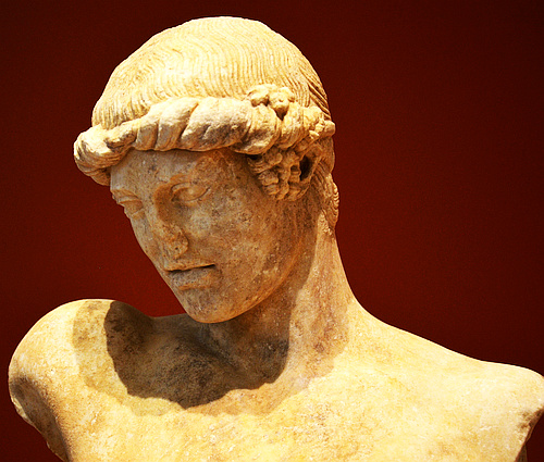 Above: Portrait head of a young woman. It was found in a family funerary monument and according to an inscription it represents Marcia Maxima. The young woman was Pavia's daughter, member of a veteran's family, who owned the funerary monument in Samos Street, Patras. Marble, Roman Period (Augustan Period, 27 BC - 14 AD). |