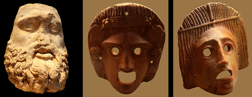 Above left: Marble head of a colossal statue of Serapis. The upper part of the head is missing and is horizontally cut off, possibly to facilitate the installation of the modion (a basket used to measure cereals), a typical attribute of the god. Patras, 2nd century AD. Terracotta models of masks from Patras. 3rd century AD (above center) and 1st - mid 2nd century AD (above right). |