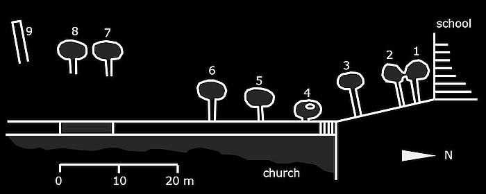 Above: My sketch plan of the Mycenaean cemetery and a photo mosaic of the nine chamber tombs in Kiveri. - Most of the tombs are well preserved with dromos, stomion and tomb chamber (for an introduction to Mycenaean burial structures: see here). They are freely accessible, quite neglected, some polluted with garbage. |