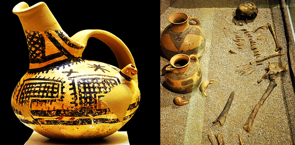 Below left: Basket rhyton with goat in a rocky landscape, Nafplion, Evangelistria, chamber tomb B, 1350-1250 BC. - Below right: Double jug, from Asine, tumulus IQ, cist grave 1971-2, 1700 - 1650 BC. |
