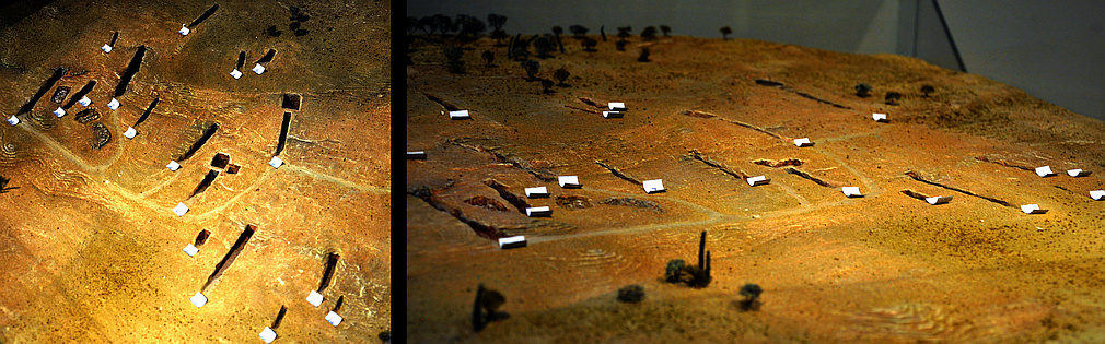 Above: Model of the Mycenaean cemetery at Dendra. - Below left: Bronze swords, 14th century BC. - Below right: Stirrup jar decorated with cult symbols, birds, flowers, double axes and horns of consecration, Midea, "Megaron", 13th century BC. |