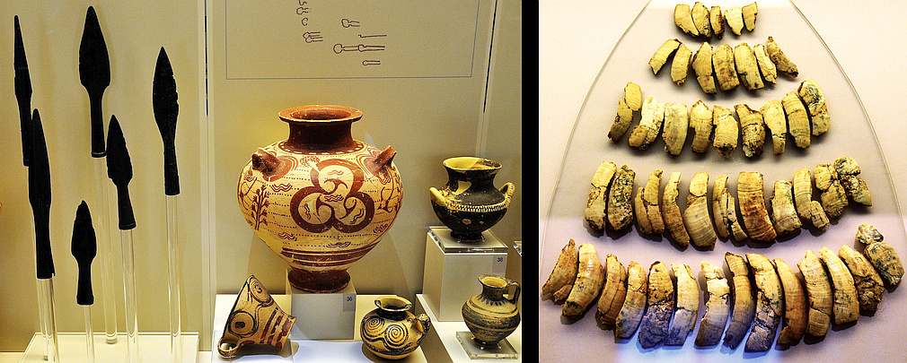 Above: Two Palatial style vases and a vase with bones, from the Kazarma tholos tomb, 1500-1450 BC. - Below left: Finds from the Mycenaean cemetery at Palaia Epidauros with spearheads and vases. - Below right: Boar's tusks from the Kazarma tholos tomb, 1500-1450 BC. |