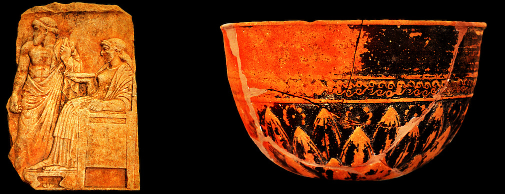Above left: A marble dedicatory relief with standing male and seated female divinities, ca. 460 BC. - Above right: Unidentified pottery. |