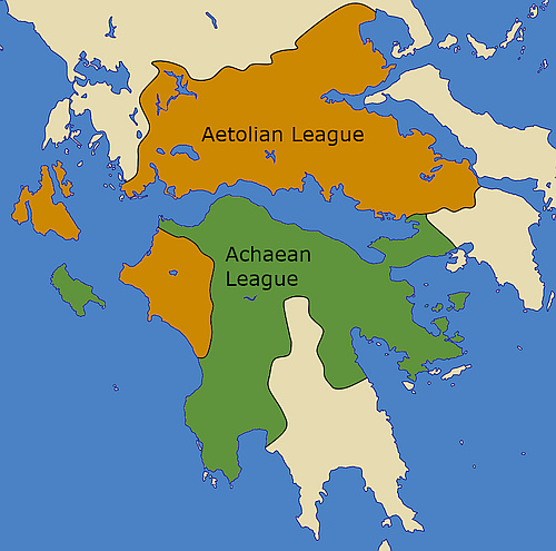 The Aetolian League was a confederation of cities in ancient Greece centered in Aetolia. In classical times, the League had a complex political and administrative structure, but then gained territory and steadily developped to a serious opponent of Macedonia and the Achaean League. During the Hellenistic period, it emerged as a dominant state in central Greece, but in its fight against Macedonia it was driven to an alliance with Rome, which resulted in the final conquest of Greece by the Romans.