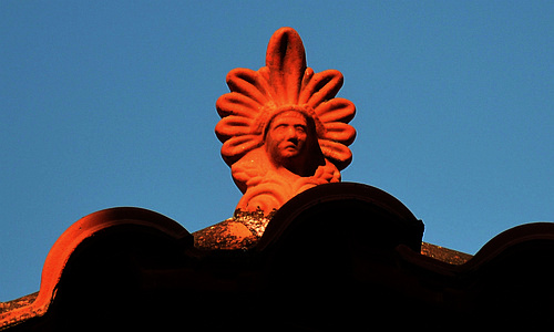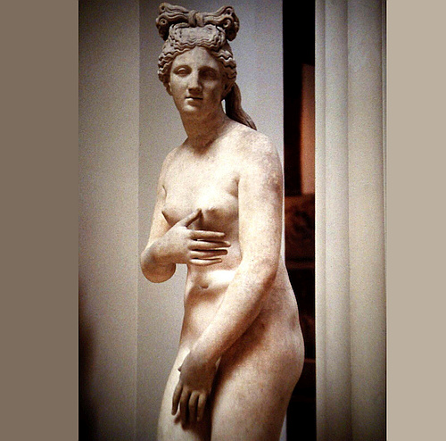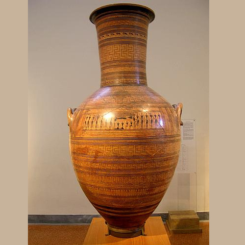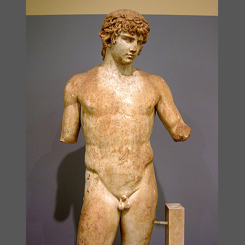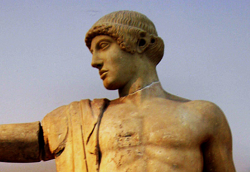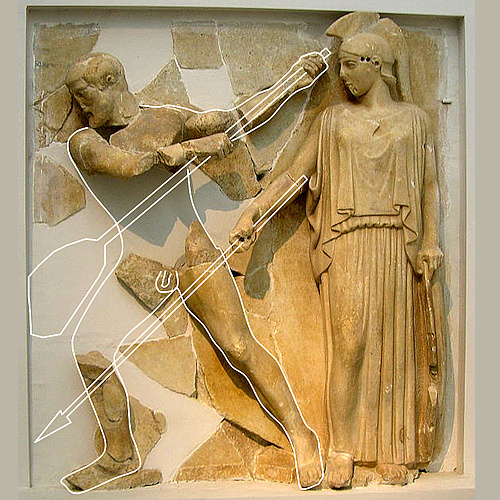 A gold plated, 11.5 m high statue of Athena, the Maiden. It stood inside the Parthenon and was the work of the legendary sculptor Phidias during the reign of Perikles, i.e. 469-429 BC. - The "Varvakeion Athena" pictured on the right, a marble statuette found in 1880 in Athens, is believed to be the truest and best preserved copy (at one-twelfth of the original).