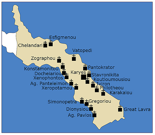 Mount Athos is the mountaineous easternmost peninsula of Chalkidike. It is an autonomous polity within the Greek Republic. In Greek, it is commonly referred to as the "Holy Mountain" (Agion Oros). It is an important centre of Eastern Orthodox monasticism with its 20 monasteries under the direct jurisdiction of the Ecumenical Patriarch of Constantinople. Mount Athos has been inhabited since ancient times and in the classical era the peninsula was known as Akté. It has a long monastic tradition, which dates back to at least 800 AD. Today, over 2,000 monks live an ascetic life in Athos, isolated from the rest of the world. Remarkable is a rich collection of well-preserved artifacts, rare books, ancient documents, and artworks of priceless historical value in the monasteries. In 1988 Mount Athos was listed as a World Heritage Site.