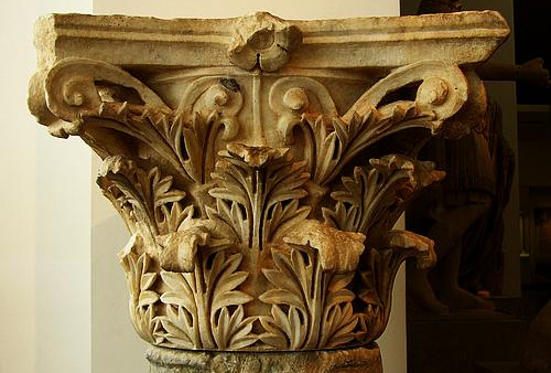 The Greek term akanthos refers to the plant Acanthus mollis, native to Mediterranean Europe. It was stylised as decorative element of capitals in the Corinthian order.