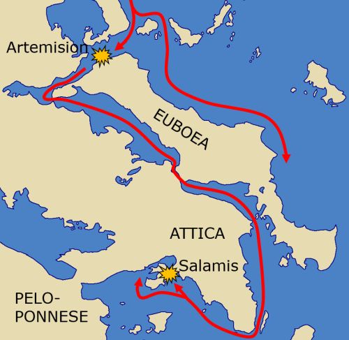 Eurybiades was the Spartan commander in charge of the Greek navy during the Second Persian invasion of Greece (480-479 BC). In spite of the Athenians' superior naval skill, the Peloponnesian city-states led by Sparta, did not accept an Athenian superior command, fearing the growing power of Athens. For all the enmity between the two, Eurybiades was ultimately assisted by the Athenian naval commander Themistokles. - The decision was to sail to Cape Artemision on the northern tip of Euboea to await the Persians there. When the Greek fleet arrived, the Persians were already there, so Eurybiades ordered a retreat, although the Euboeans begged him to stay. The Euboeans then bribed Themistokles to keep the fleet there and according to Herodotus he used some of his bribe to pay off Eurybiades. The ensuing sea Battle of Artemision was indecisive, but the Greeks could not bear further losses and sailed south, heading for Piraeus. A part of the Persians fleet was sent eastward around Euboea, but a terrible storm destroyed almost the complete contingent. The other Persian ships followed the Greeks through the Euripus Strait. - Eurybiades wanted to continue the battle at the isthmus of Corinth, but Themistokles saw better naval tactical advantages at Salamis. He threatened to withdraw the Athenian fleet, the largest contingent of the Greek forces. After Themistokles tricked the Persian king Xerxes I into sending part of his fleet around the island of Salamis to blockade the Greek fleet in the south, Eurybiades had no choice. The Battle of Salamis then was a decisive victory for the Greeks. After the battle Eurybiades did not want to chase the retreating Persian fleet, but wanted Xerxes to be able to escape rather than have him remain in Greece where he would possibly renew the land war. - Back in Sparta Eurybiades was rewarded with an olive wreath for his success at Salamis and Themistokles received a similar award in Athens.