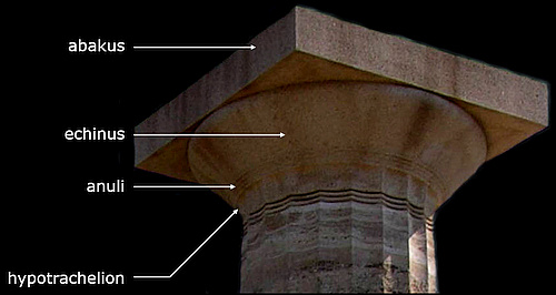 The lower part, formed like a cushion, of a Doric capital. It lies above the round shaft of the column and the square abakus. In the Ionic order it has an egg-and-dart decoration.